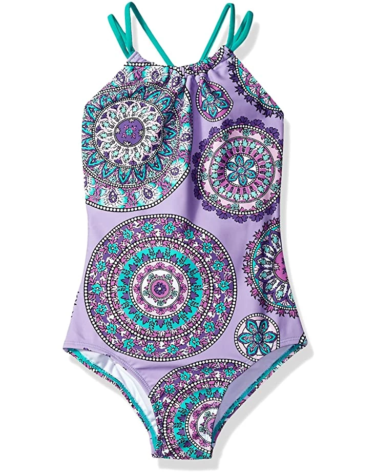 - Have her covered at the beach or pool with the Kanu Surf Beach Sport Halter One-Piece Swimsuit. This bathing suit is crafted with two racerback straps that cross at the back, made from a sun protective fabric and have a circular floral pattern to add a delicate finish to her look.