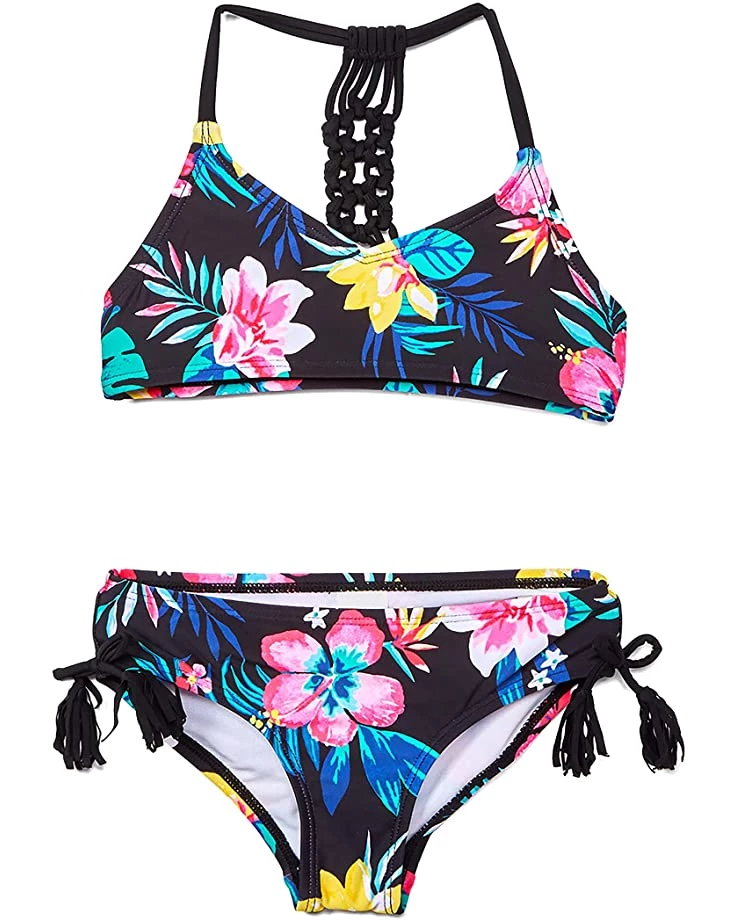 - Finished with colorful allover tropical pattern.